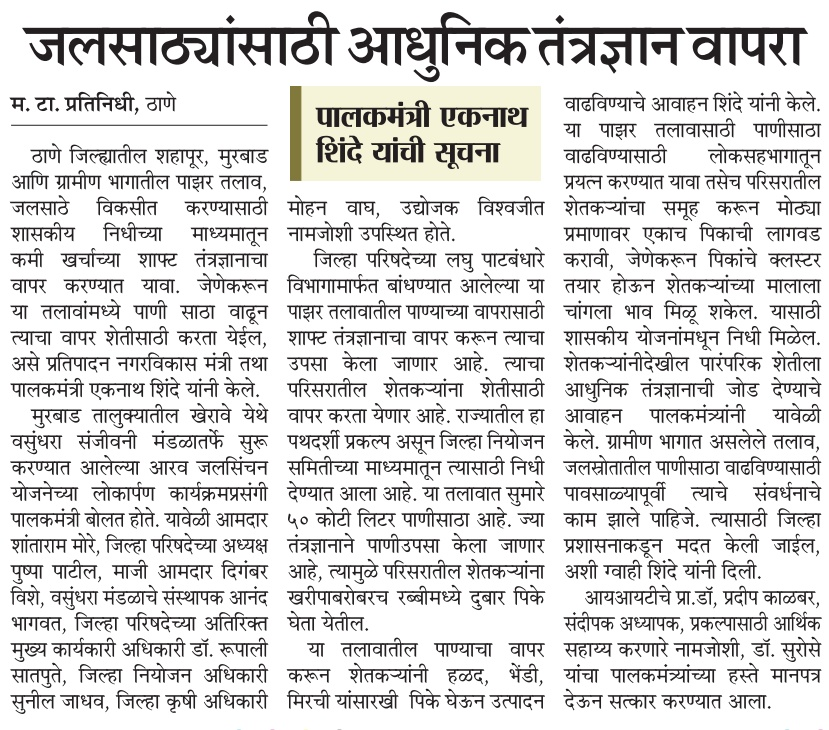 The project was implemented on Turnkey basis by Waterfield Technologies Pvt Ltd. The Technology for Shaft was provided by Dr Kalbhar of IIT Mumbai.